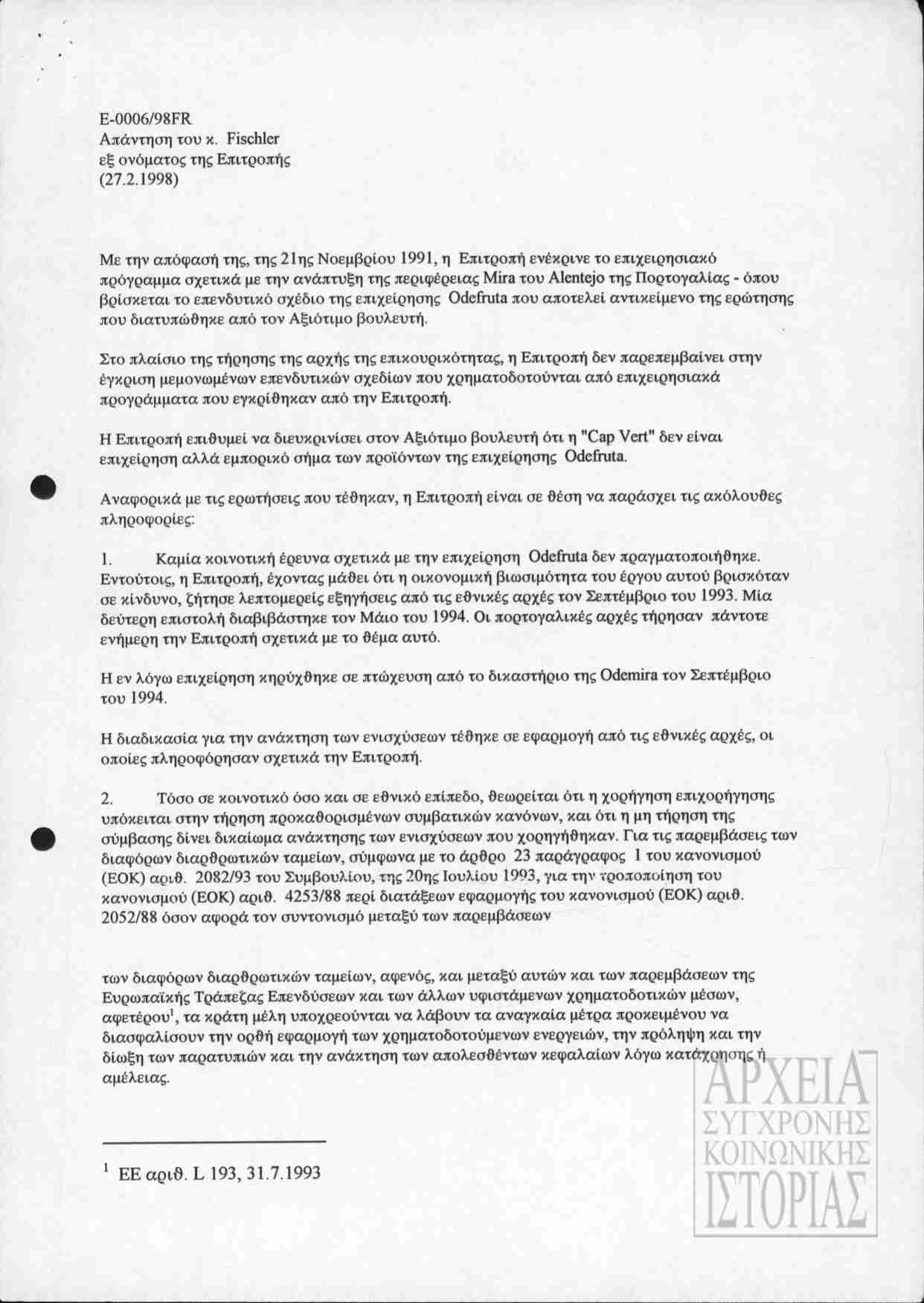 | ΠΑΡΟΥΣΙΑΣΗ ΠΕΡΙΕΧΟΜΕΝΟΥ | Γραπτή ερώτηση (αρ.Ε-0006/98) και απάντηση σχετικά με τις επιχορηγήσεις που έλαβε η πορτογαλική εταιρία "Odefruta" απο την Ε.Ε. και την υποχρέωση επιστροφής αυτών κατόπιν της πτώχευσής της. |