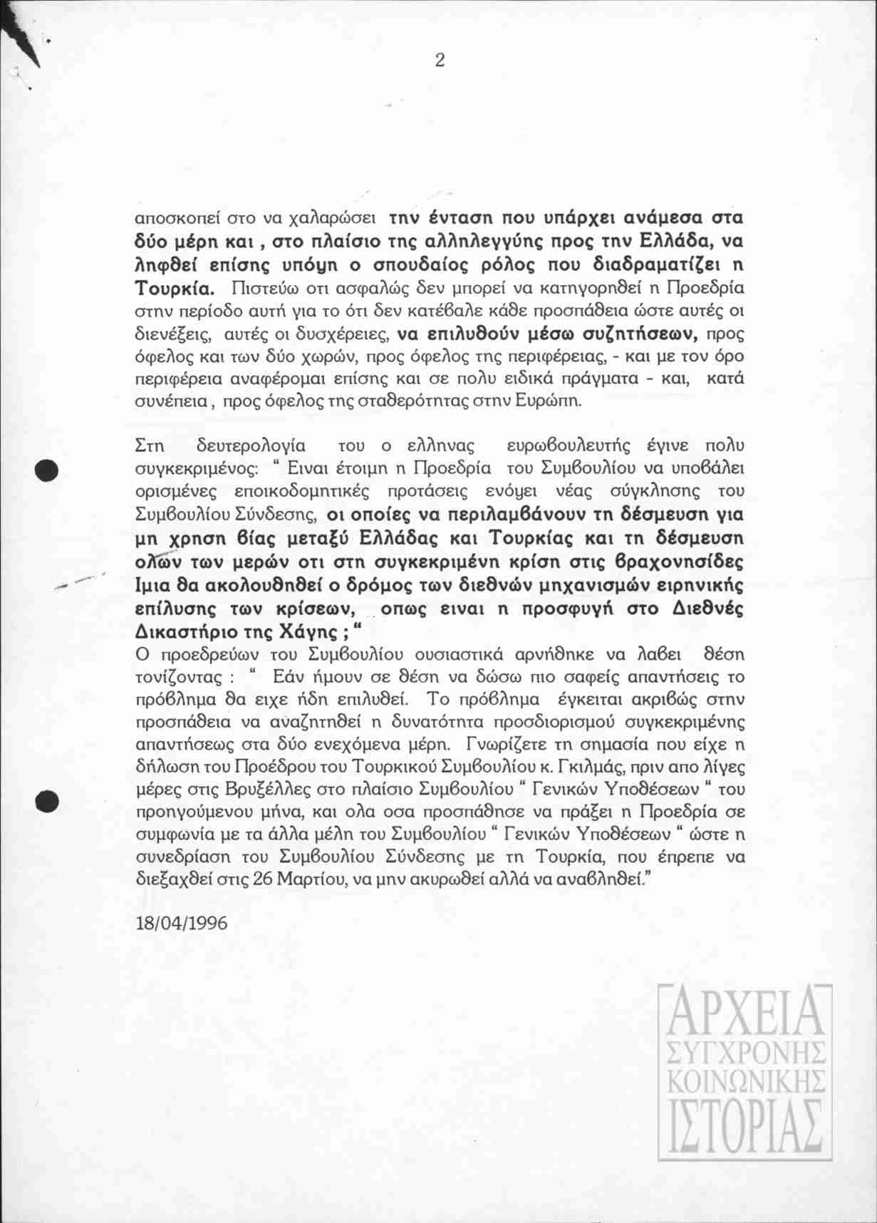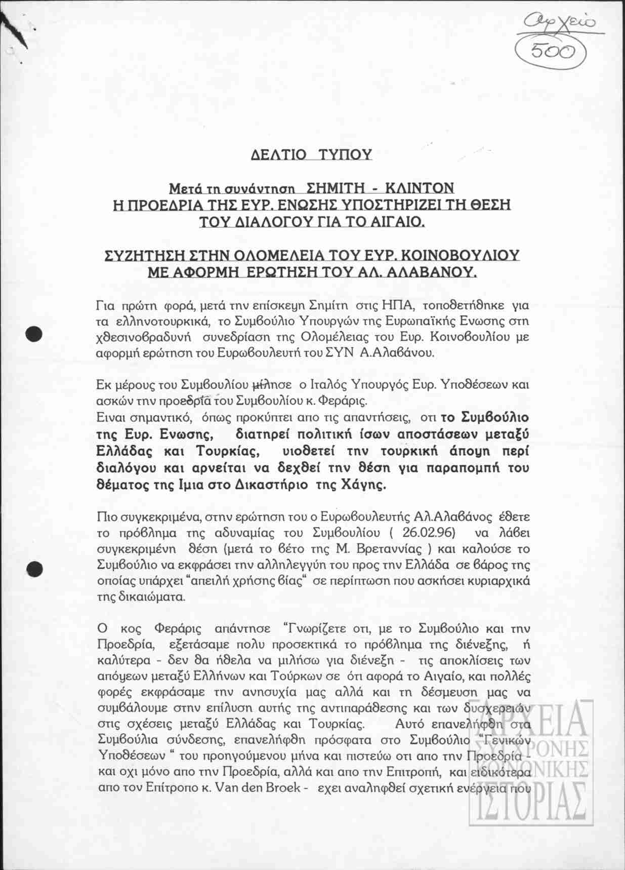Ταυτότητα Τεκμηρίου: ΑΡΧΕΙΑ ΕΥΡΩΒΟΥΛΕΥΤΩΝ~ΑΡΧΕΙΟ ΑΛΑΒΑΝΟΥ~Πολιτική Επικοινωνία~02. Δελτία τύπου~1996~04ος~00001